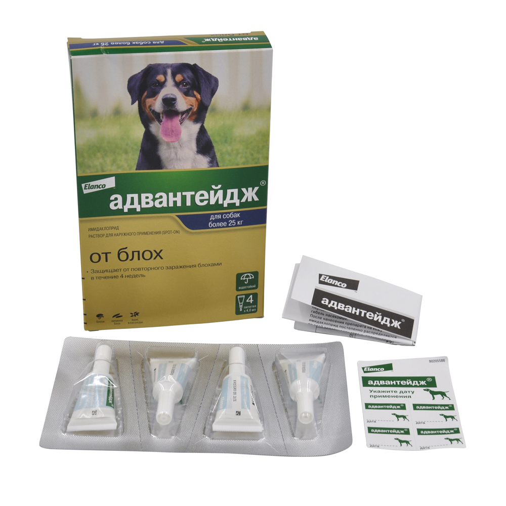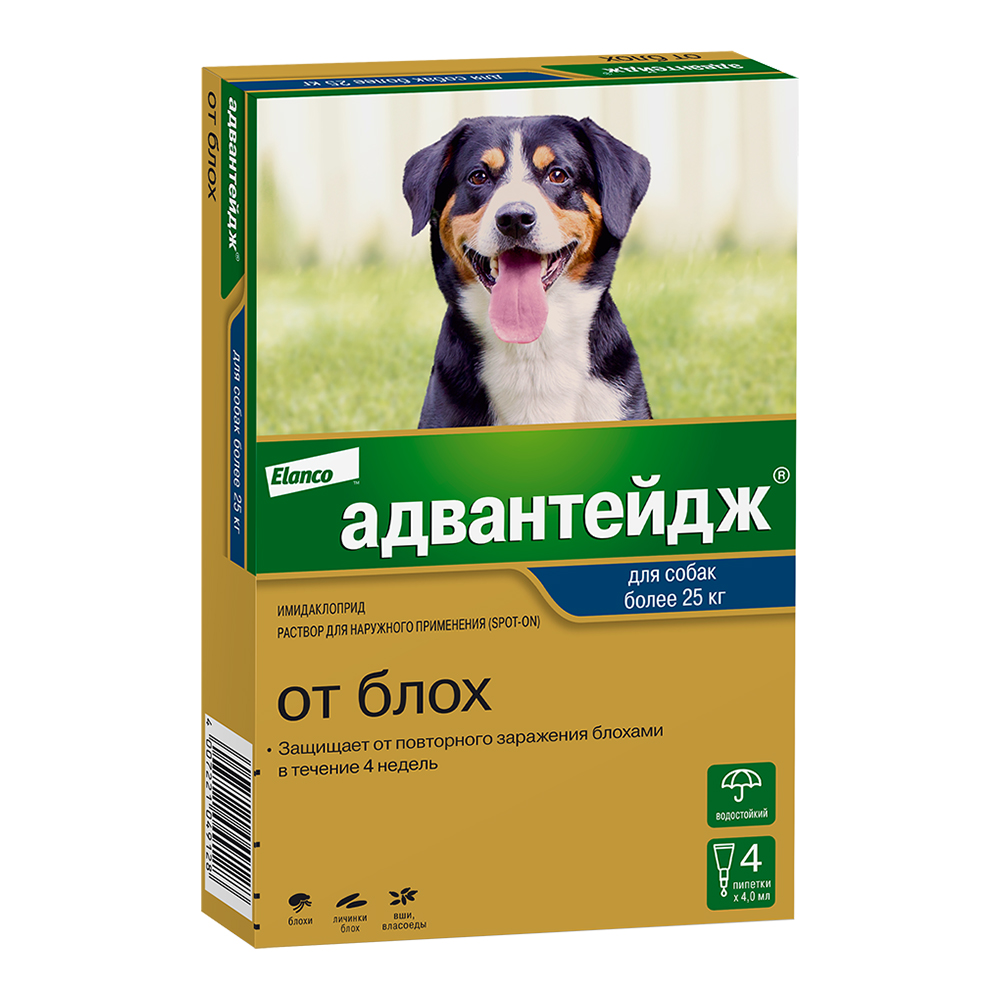 Адвантейдж® помогает защитить собак от блох, их укусов, снижая риск передачи переносимых ими заболеваний. Капли от блох для собак Адвантейдж® содержат действующее вещество имидаклоприд, которое начинает действовать на блох уже в течение 3-5 минут после контакта.