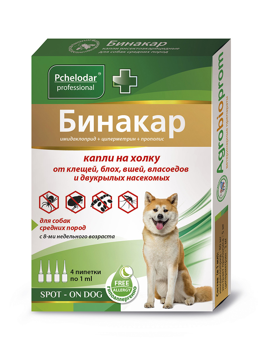 —Бинакар для средних пород собак капли на холку от блох и клещей 1мл/4пип (1 пип на 10 кг)