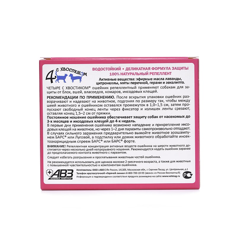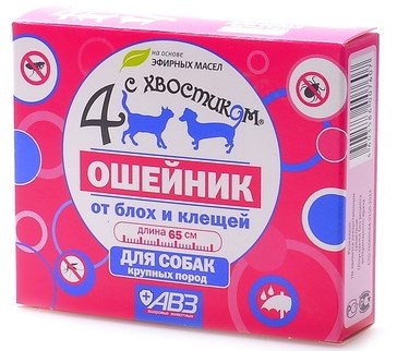 Ошейник репеллентный «Четыре с хвостиком» применяют собакам для защиты от блох, вшей, власоедов, комаров, иксодовых и чесоточных клещей. После вскрытия упаковки ошейник надевают на животное, подгоняя по размеру так, чтобы между шеей и ошейником оставался промежуток в 1 см, затем пропускают свободный конец ленты через фиксатор, а излишек ленты отрезают, оставляя конец 1,5-2 см.