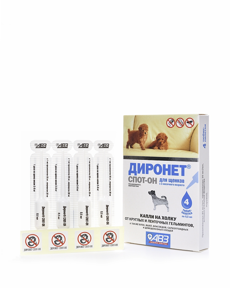 Преимущества: -Средство от гельминтов в виде капель на холку. -Быстро и эффективно избавит животное от всех видов гельминтов и наружных паразитов. -Идеально подходит для капризных питомцев, отказывающихся от таблеток и суспензий. -Обеспечивает максимальный лечебный эффект без стресса у животного. Противопоказания: Повышенная индивидуальная чувствительность животного к компонентам препарата. «Диронет спот-он» запрещается щенкам моложе 2-месячного возраста, беременным, кормящим, больным инфекционными болезнями и выздоравливающим животным. Содержит: 85 мг празиквантела, 20 мг ивермектина, а также вспомогательные вещества.