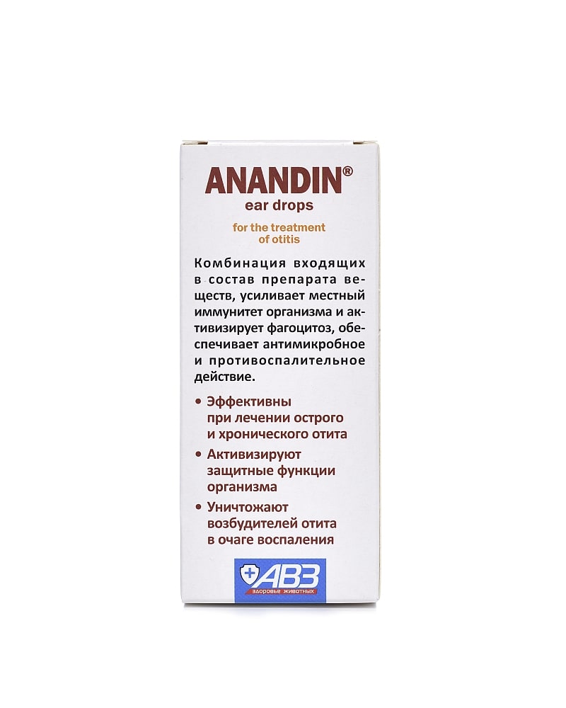Капли ушные Анандин предназначены для лечения острого и хронического воспаления наружного слухового прохода (наружного отита) бактериальной этиологии у собак и кошек.