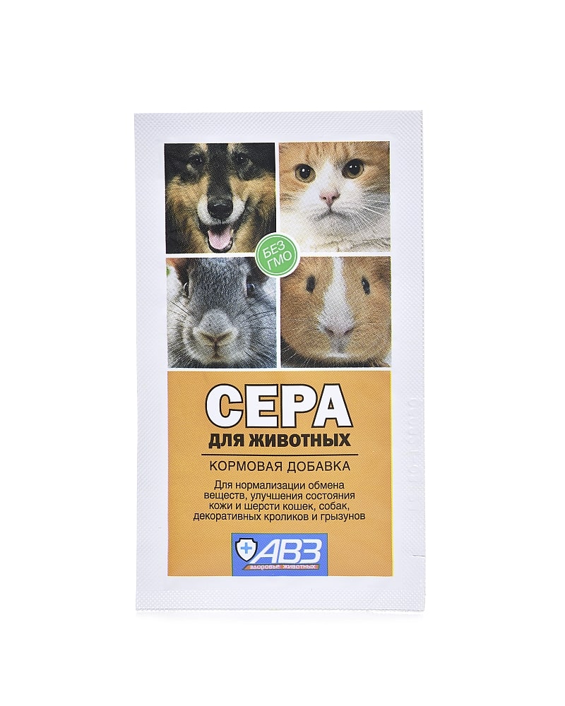 Сера для животных - дополнительный источник серы к повседневному питанию, применяется также при нарушении обменных процессов, для предупреждения болезней кожи и шерсти у собак, кошек, декоративных кроликов и грызунов. Введение добавки в ежедневный рацион ускоряет рост шерсти (особенно в период линьки), способствует её блеску, интенсивной пигментации, предупреждает ломкость волос и появление перхоти.