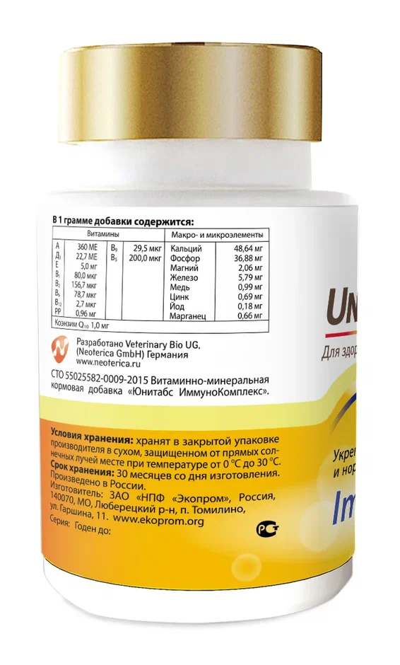 В состав Unitabs ImmunoComplex входит 21 элемент для комплексного действия: коэнзим Q10, витамины А, D3, Е, В1, В2, В6, В12, РР, В9, В5, кальций, фосфор, магний, железо, медь, цинк, йод, марганец, омега-6 и омега-3. Оптимальный баланс витаминов, макро- и микроэлементов способствует повышению иммунной сопротивляемости организма на протяжении всей жизни собаки и в периоды восстановления после болезни.