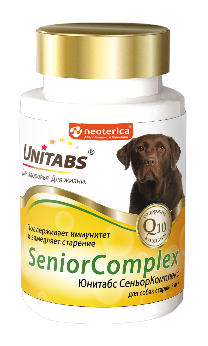 Unitabs SeniorComplex — это витаминно-минеральный комплекс для собак старше 7 лет, который содержит коэнзим Q10 и все необходимые витамины, макро- и микроэлементы для нормализации обмена веществ и укрепления иммунитета.