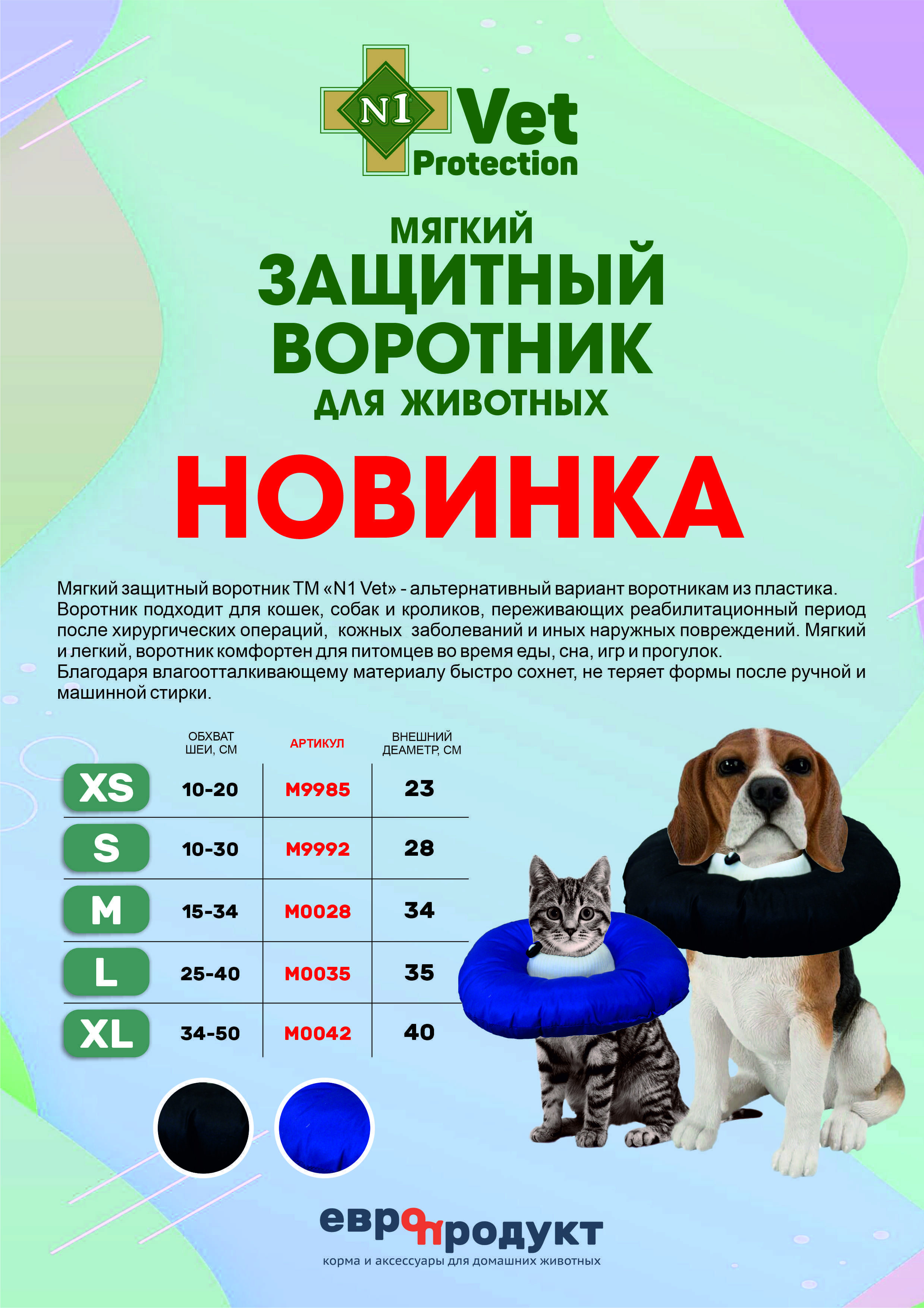 Мягкий защитный воротник ТМ №1 Vet - альтернатива пластиковым. Диаметр данного 25см, а обхват шеи 25-40см. Воротник создан для кошек, собак и кроликов, переживающих реабилитационный период после хирургических операций, кожных заболеваний и иных наружных повреждений. Мягкий воротник комфортен для питомцев во время сна, приема еды, игр и прогулок. Благодаря влагоотталкивающему материалу быстро сохнет и не теряет форму после всех видов стирки.